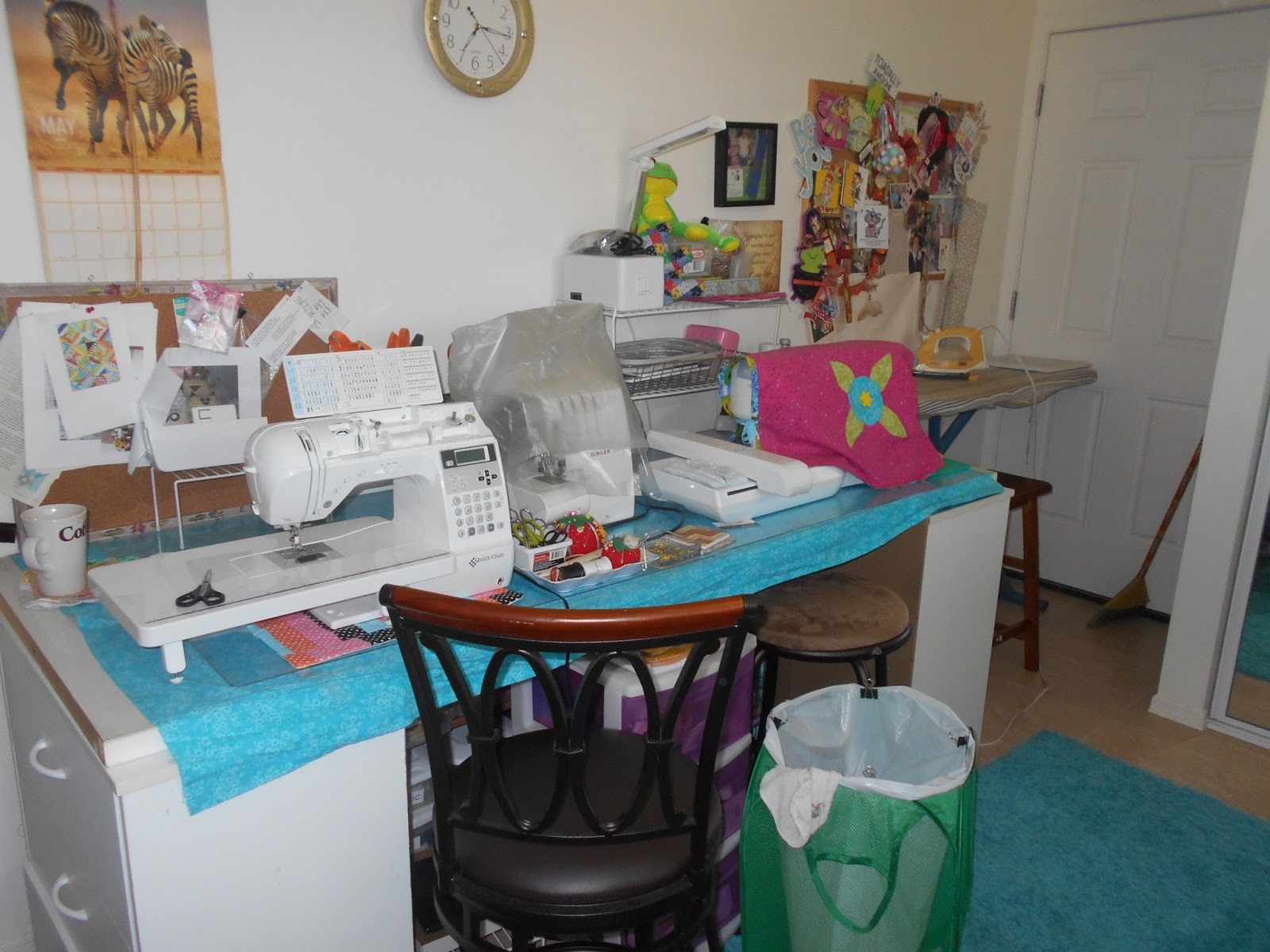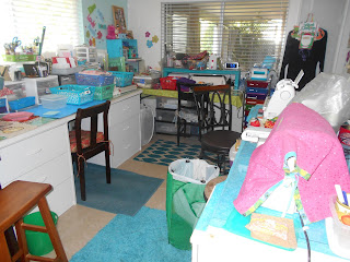 It gets a little out of hand after a few hours and I stop, sweep, put everything back in the proper place and then I start all over again. Recently I really did a full scale tidy-up, putting 3 extra sewing machines in a closet, reorganizing stacks and stashes. Two years ago I had spent 2 years sewing quilts for the Homeless Veterans in Northern AZ, those precious protectors who were now living in tents in the forest, old cars, or storage sheds. I made 55 quilts for those souls, I crocheted scarves and afghans to help keep them warm in the winter days of Northern Az. Then I covered the sewing machines, put away the cloth projects and rolled across the room to the paper side. I made card after card, creating and happy. Now I am back to sewing,...totes, purses, cell phone cases, napkins, hanging towels, quilts. I am happy girl. Here is my cleaned up Craft Room.