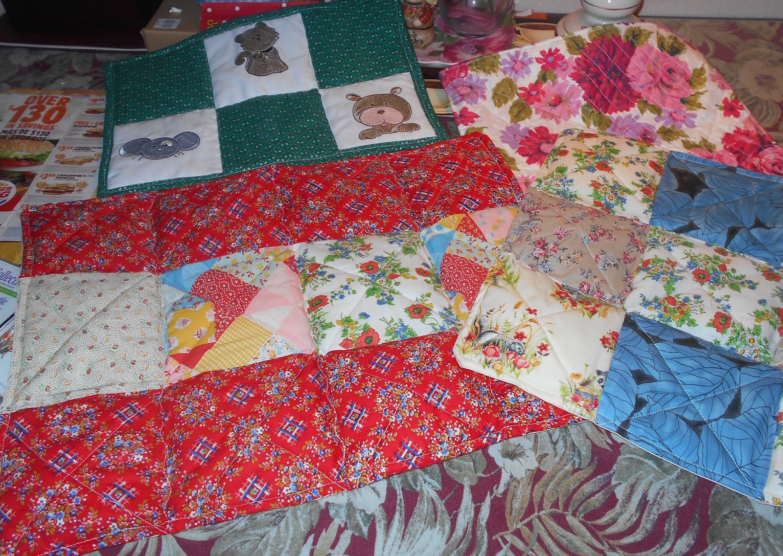 It is my heart's delight to be able to sew. It is my happy spot in life, sewing this n' that, sometimes just to sew up some pretty fabric, many times to sew something special for family or friends to make them smile, and many many times to sew up to donate. I sew a lot for Lanette Veres, http://www.graymattersfoundation.org/, and I love to sew up little quilts for the dogs and cats at the local Humane Society. I can use up scraps of fabric, and they do not care if the quilt is precise or fabric coordinated. Here are some recent quilts for those fur babies.