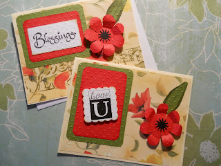 I am still at it.... "it" being a massive tidy up of all things laying around...lids of embellishments and sentiments and papers. I found this wonderful paper that I kept putting on the bottom of stacks because I loved it so and hated to use it up. Today was the time to create with it. The flowers were cut long ago and I've forgotten which cartridge I used....the flowers were altered a bit by trimming the flower petals. I cut away the leaf that was attached and I fussy cut a longer leaf. The center of the red flower is a sunburst punch in black. The sentiment and flowers have been embossed with Cuttlebug Swiss Dots. The sentiment Blessing is a rubber stamp and the small "Love U" is from Cutting Cafe's "Fun with Valentine's Day" printables. You can see that wonderful set here. I am on sort of a hiatus from the Cutting Cafe Design Team but I will certainly keep using Regina's wonderful printables. They make my cards what they are!...