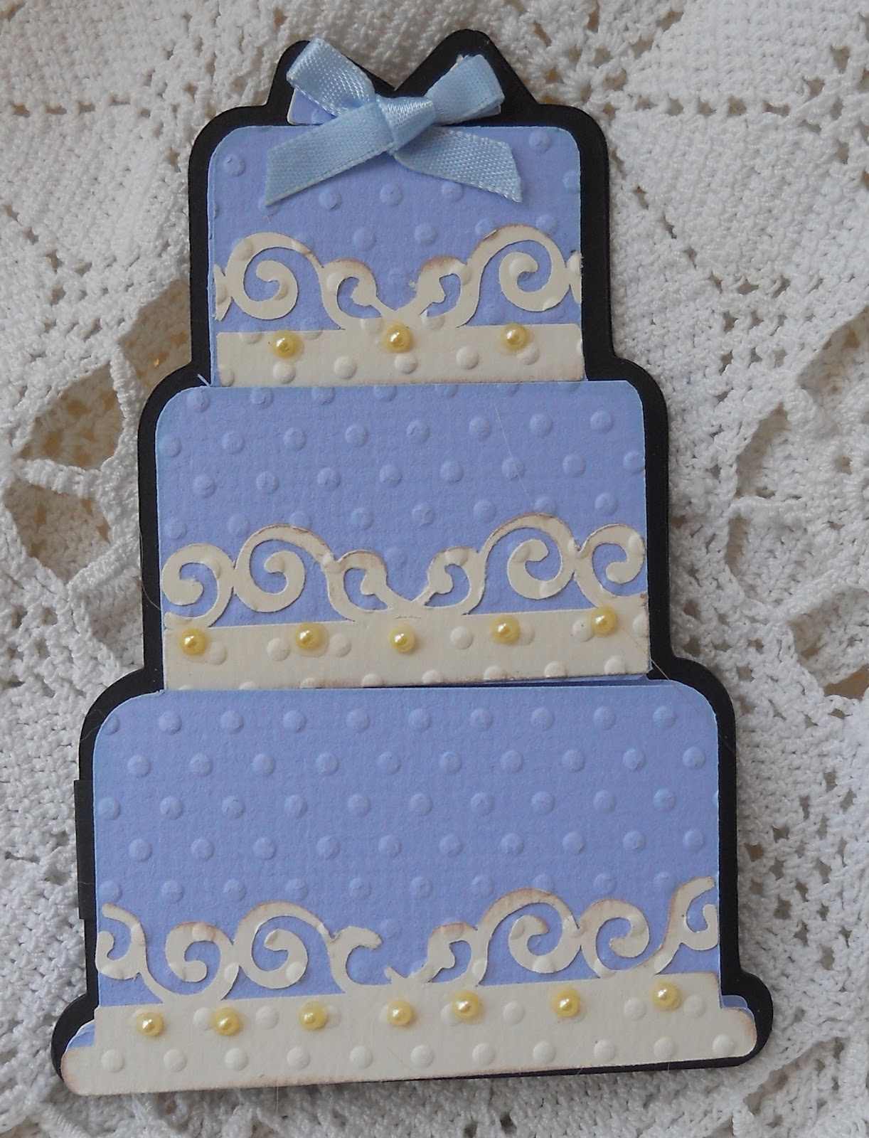 Here is my card. I cut a shape card for the cake...something I rarely do. I couldn't get my Gypsy to wander over to the weld section and wander back so I had to be a bit clever in this shaped design. I cut 2 of the main cake in blue, and one in ivory cardstock which was glued inside after I added a black fold tab. I put the one blue cut onto the black shadow cut, and then I cut the cake in 3 sections and began the popdotting process. That lowest layer actually has double popdots. Once I added the pretty scrolled decor on the cake, I also added sweet white pearls, and a blue ribbon. Before I glued the blue cake layers to the top shadow, I inserted the black fold tab, and this allows me to open and close the card in one piece. The inside of the cake has a EK Success Border and a Happy Wedding Day sentiment on a square punch. The card is about 5 inches tall and 3 inches wide and fits nicely in an A2 size envelope.